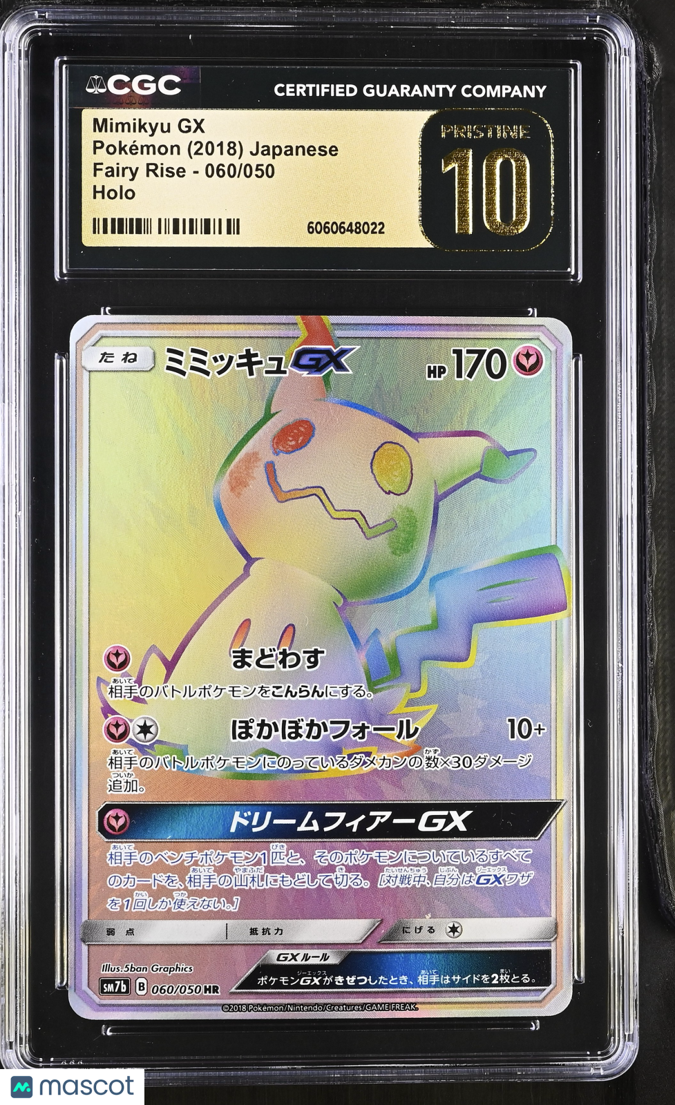 You are purchasing a Pokemon Mimikyu GX #060/050 Japanese CGC 10. You will receive the exact item in the photographs. Be sure to check our store for hundreds of other graded cards just like this one. Follow our store to receive exclusive discounts on graded cards and other Pokemon products. Join us during our LIVE stream events where we showcase graded cards, raw singles, and booster packs. Thank you for looking. Listed With Mascot.