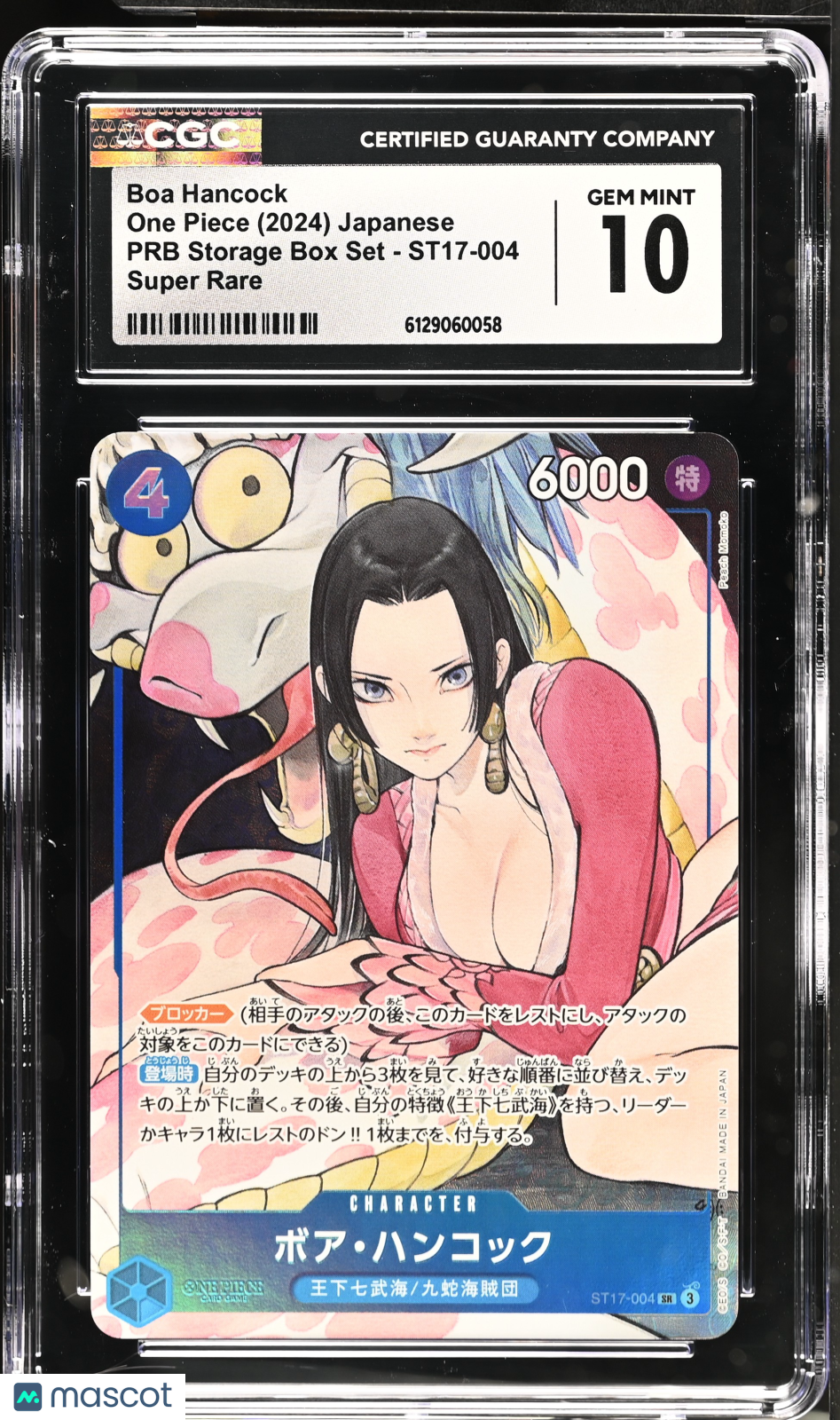 Boa Hancock #ST17-004 Japanese 2024 One Piece PRB Storage Box Set CGC 10 Don't miss your chance to own this stunning Boa Hancock #ST17-004 card from the highly sought-after 2024 One Piece PRB Storage Box Set! Professionally graded a perfect CGC 10, this Japanese card stands out as a true gem for collectors and fans of the One Piece trading card game. With only 135 in the population, this card is a rare find and a must-have centerpiece for any serious collection. Certified by the reputable Certified Guaranty Company (CGC) and featuring the official certification number 6129060058, this card guarantees authenticity and top-tier condition. Whether you're looking to upgrade your One Piece TCG collection or searching for the perfect gift for a fellow fan, this Boa Hancock card is sure to impress with its pristine grade and exclusive storage box set origin. Graded: Yes Game: One Piece Set: 2024 One Piece PRB Storage Box Set Language: Japanese Character: Boa Hancock Certification Number: 6129060058 Grader: Certified Guaranty Company (CGC) Manufacturer: One Piece Population: 135 Features: / Grade: 10 Year Manufactured: 2024 Card Number: ST17-004