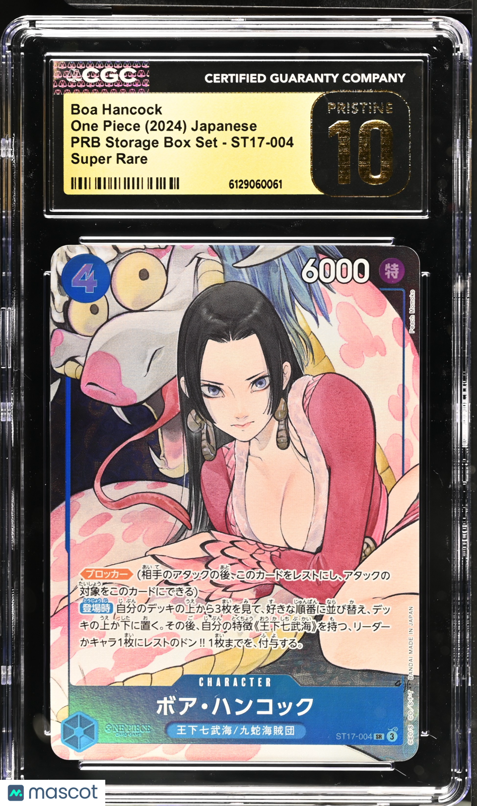 Boa Hancock #ST17-004 Japanese 2024 One Piece PRB Storage Box Set CGC 10 Calling all One Piece collectors! This stunning Boa Hancock #ST17-004 card from the 2024 One Piece PRB Storage Box Set is a must-have for your collection. Graded a perfect CGC 10, this Japanese card is highly sought after, with only 266 in the population, making it a rare gem for fans and investors alike. With official certification by Certified Guaranty Company (CGC) and a unique certification number (6129060061), you can buy with confidence, knowing you're adding a genuine, top-tier collectible to your lineup. Don’t miss out on owning this pristine card featuring the iconic Boa Hancock—secure it today before it’s gone! Graded: Yes Game: One Piece Set: 2024 One Piece PRB Storage Box Set Language: Japanese Character: Boa Hancock Certification Number: 6129060061 Grader: Certified Guaranty Company (CGC) Manufacturer: One Piece Population: 266 Features: / Grade: 10 Year Manufactured: 2024 Card Number: ST17-004