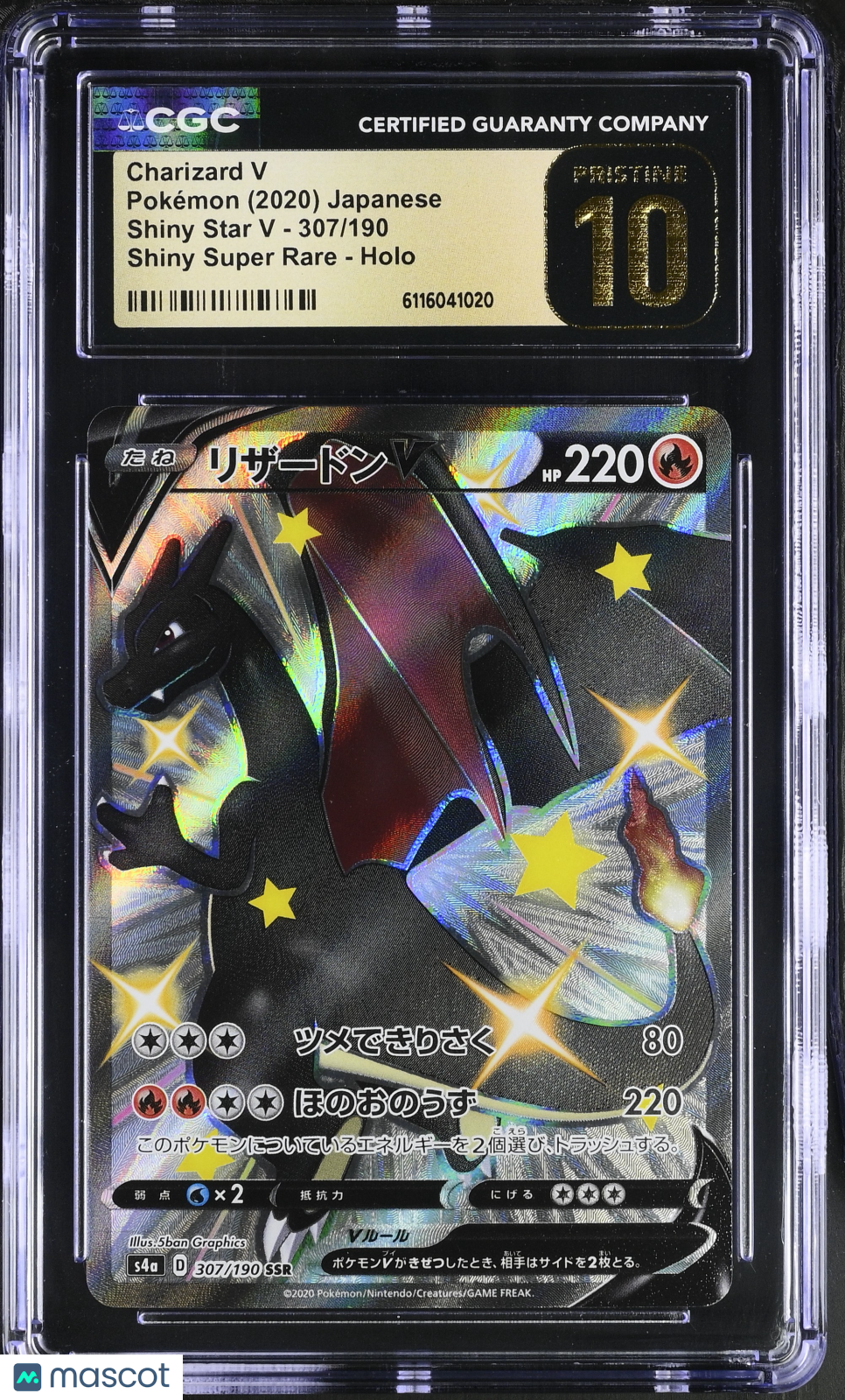 Charizard V #307/190 Japanese 2020 Pokemon Shiny Star V CGC 10 Don't miss your chance to own this stunning Charizard V Shiny Super Rare from the 2020 Pokemon Shiny Star V set! Professionally graded a perfect CGC 10, this Japanese holo card stands out as a true collector’s gem. With only 309 in the population, this card is a must-have centerpiece for any serious Pokemon collection, featuring the iconic Charizard in brilliant Shiny form. This rare card comes authenticated by Certified Guaranty Company (CGC) with certification number 6116041020, guaranteeing its quality and authenticity. Whether you're looking to complete your Shiny Star V set or seeking an investment-worthy addition, this Charizard V is ready to shine in your collection. Act fast—high-grade Charizard cards are in high demand and won't last long! Set: 2020 Pokemon Shiny Star V Character: Charizard V Certification Number: 6116041020 Grader: Certified Guaranty Company (CGC) Grade: 10 Year Manufactured: 2020 Graded: Yes Rarity: Shiny Super Rare Game: Pokemon Language: Japanese Manufacturer: Pokemon Population: 309 Features: Shiny Super Rare Card Number: 307/190 Finish: Holo Listed With Mascot.