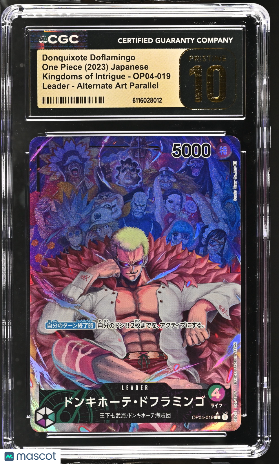 Donquixote Doflamingo #OP04-019 Japanese 2023 One Piece Kingdoms Of Intrigue CGC 10 Calling all One Piece collectors! This is your chance to own a stunning Donquixote Doflamingo #OP04-019 Alternate Art Parallel card from the highly sought-after 2023 One Piece Kingdoms Of Intrigue set. Professionally graded a perfect CGC 10, this Japanese card is a true gem, with only 22 in the population—making it a rare and valuable addition to any serious collection. With official certification and a unique certification number (6116028012), this card offers both authenticity and investment potential. Don’t miss out on this opportunity to secure a top-grade, limited-population collectible featuring one of the most iconic characters in the One Piece universe! Graded: Yes Game: One Piece Set: 2023 One Piece Kingdoms Of Intrigue Language: Japanese Character: Donquixote Doflamingo Certification Number: 6116028012 Grader: Certified Guaranty Company (CGC) Manufacturer: One Piece Population: 22 Grade: 10 Year Manufactured: 2023 Card Number: OP04-019 Finish: Alternate Art Parallel Listed With Mascot.