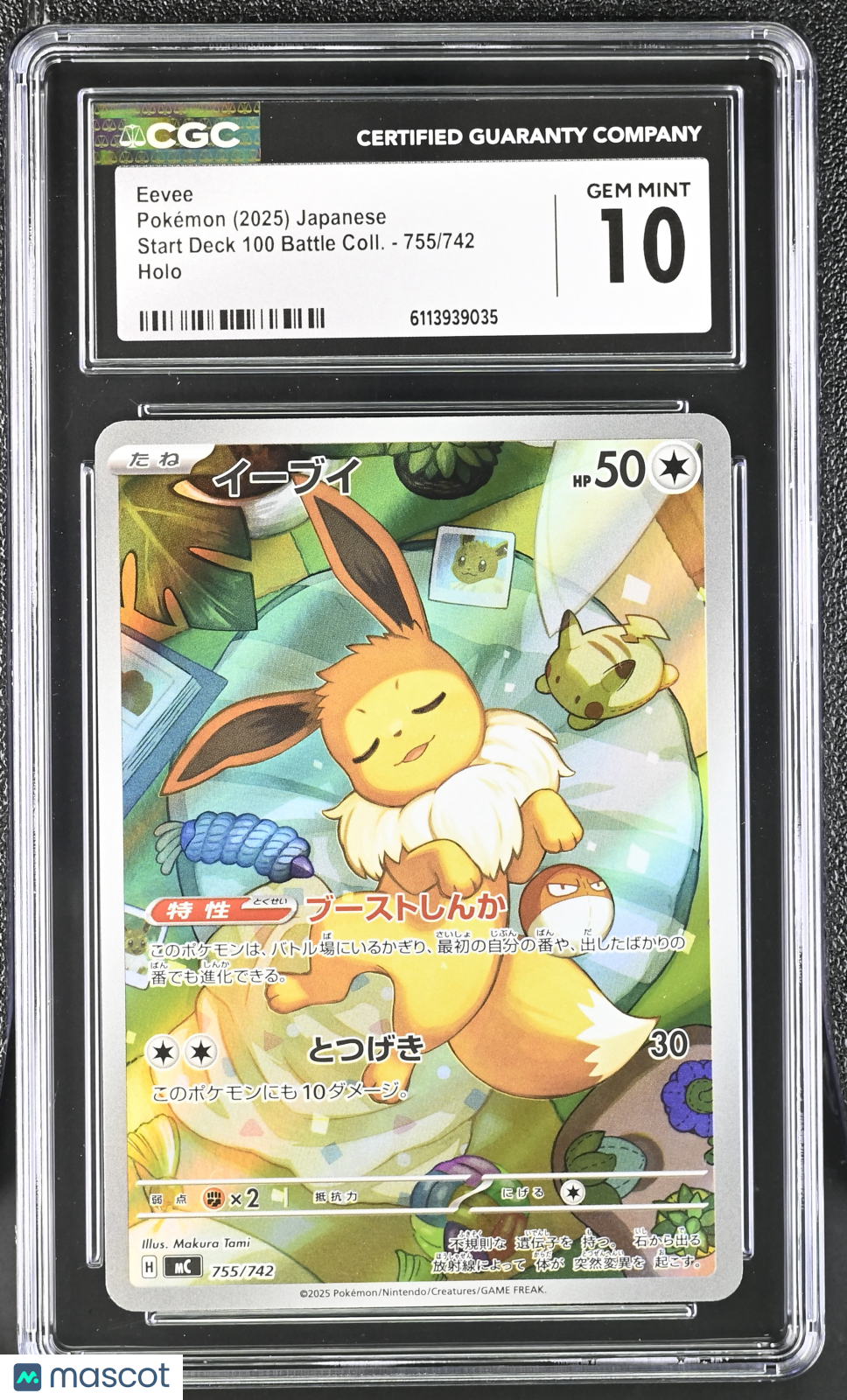 Eevee #755/742 Japanese 2025 Pokemon Start Deck 100 Battle Coll. CGC 10 Add a stunning piece to your collection with this Japanese Eevee #755/742 holo card from the 2025 Pokemon Start Deck 100 Battle Collection! Professionally graded a perfect CGC 10, this rare gem is one of only 6 in the population, making it a must-have for serious Pokemon collectors and Eevee fans alike. Don’t miss your chance to own a top-grade card that stands out for its exceptional quality and eye-catching finish. Certified by the trusted Certified Guaranty Company (CGC) and featuring a unique certification number, this card is guaranteed authentic and in pristine condition. With its vibrant holo finish and exclusive 2025 release, this Eevee is a highly sought-after addition to any Pokemon TCG collection. Act fast—opportunities to own such a rare, high-grade card are extremely limited! Graded: Yes Set: 2025 Pokemon Start Deck 100 Battle Coll. Game: Pokemon Language: Japanese Character: Eevee Certification Number: 6113939035 Grader: Certified Guaranty Company (CGC) Manufacturer: Pokemon Population: 6 Grade: 10 Year Manufactured: 2025 Card Number: 755/742 Finish: Holo Listed With Mascot.