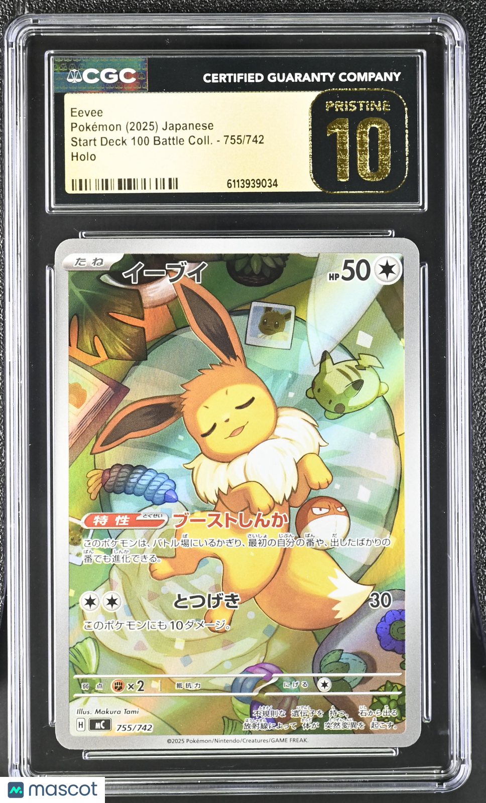Eevee #755/742 Japanese 2025 Pokemon Start Deck 100 Battle Coll. CGC 10 Don’t miss your chance to own this ultra-rare Eevee #755/742 from the 2025 Pokemon Start Deck 100 Battle Collection! Professionally graded a perfect CGC 10, this Japanese holo card is a true gem for collectors and fans alike. With only 3 in the population, this card stands out as a top-tier investment and centerpiece for any serious Pokemon collection. Certified by the trusted Certified Guaranty Company (CGC) and featuring a unique certification number, this Eevee card offers authenticity and peace of mind. Secure this highly sought-after collectible today—these don’t come up often, and demand is only going up! Graded: Yes Set: 2025 Pokemon Start Deck 100 Battle Coll. Game: Pokemon Language: Japanese Character: Eevee Certification Number: 6113939034 Grader: Certified Guaranty Company (CGC) Manufacturer: Pokemon Population: 3 Grade: 10 Year Manufactured: 2025 Card Number: 755/742 Finish: Holo Listed With Mascot.