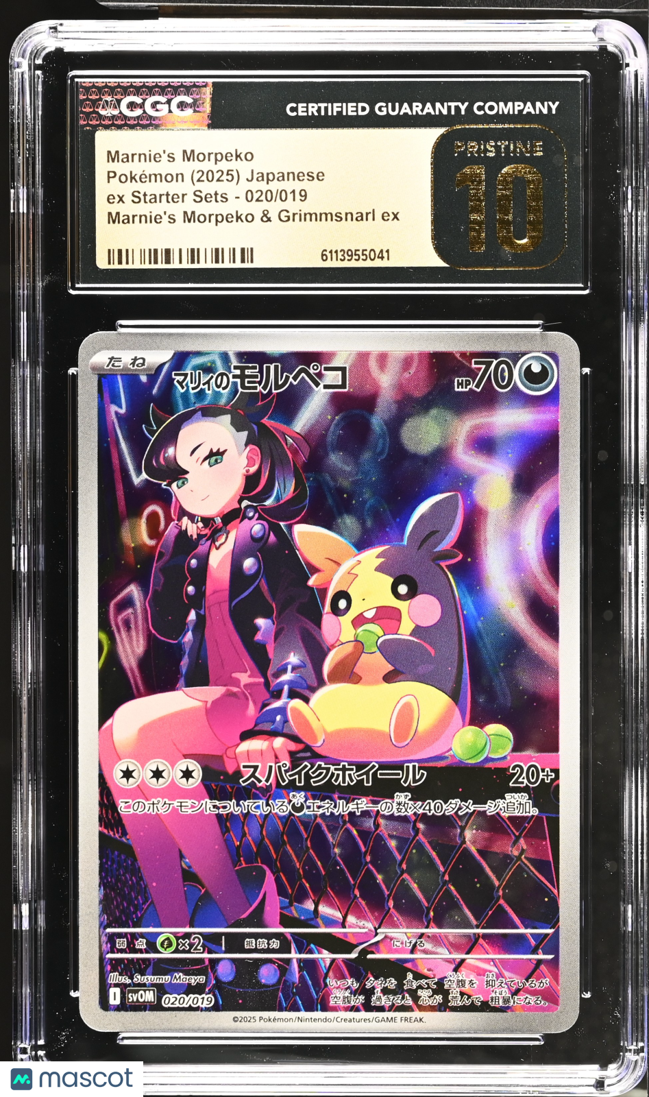 Marnie's Morpeko #020/019 Japanese 2025 Pokemon EX Starter Sets CGC 10 Don’t miss your chance to own this stunning Marnie's Morpeko #020/019 from the 2025 Pokemon EX Starter Sets, graded a perfect CGC 10! This highly sought-after Japanese card features the exclusive Marnie's Morpeko & Grimmsnarl ex finish and is a standout addition for any serious Pokemon TCG collector. With a population of only 238 and verified authenticity by Certified Guaranty Company, this card is a rare find that will elevate your collection. Whether you’re a passionate fan of Marnie, a Morpeko enthusiast, or simply looking for a top-tier graded Pokemon card, this gem is a must-have. Secure this pristine, investment-grade collectible today—opportunities like this don’t last long! Graded: Yes Set: 2025 Pokemon EX Starter Sets Game: Pokemon Language: Japanese Character: Marnie's Morpeko Certification Number: 6113955041 Grader: Certified Guaranty Company (CGC) Manufacturer: Pokemon Population: 238 Grade: 10 Year Manufactured: 2025 Card Number: 020/019 Finish: Marnie's Morpeko & Grimmsnarl ex Listed With Mascot.