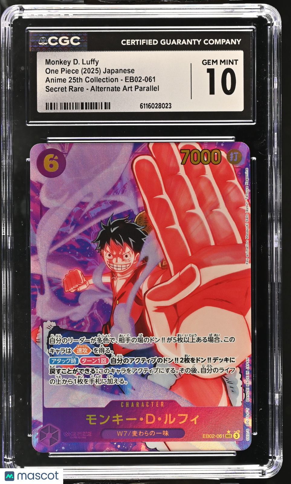 Monkey D. Luffy #EB02-061 Japanese 2025 One Piece Anime 25th Collection CGC 10 Don’t miss your chance to own this stunning Monkey D. Luffy #EB02-061 card from the highly anticipated 2025 One Piece Anime 25th Collection! Professionally graded a perfect CGC 10, this Japanese Alternate Art Parallel is a true gem for any One Piece or trading card enthusiast. With only 14 in the population, this rare collectible is a must-have centerpiece for serious collectors and fans of the legendary Straw Hat captain. Certified by the respected Certified Guaranty Company (CGC) and boasting a unique certification number, this card stands out for its pristine condition and exceptional finish. Whether you’re looking to complete your One Piece collection or invest in a high-demand card, this Luffy makes an unbeatable addition. Secure it now before it’s gone! Graded: Yes Game: One Piece Set: 2025 One Piece Anime 25th Collection Language: Japanese Character: Monkey D. Luffy Certification Number: 6116028023 Grader: Certified Guaranty Company (CGC) Manufacturer: One Piece Population: 14 Grade: 10 Year Manufactured: 2025 Card Number: EB02-061 Finish: Alternate Art Parallel Listed With Mascot.