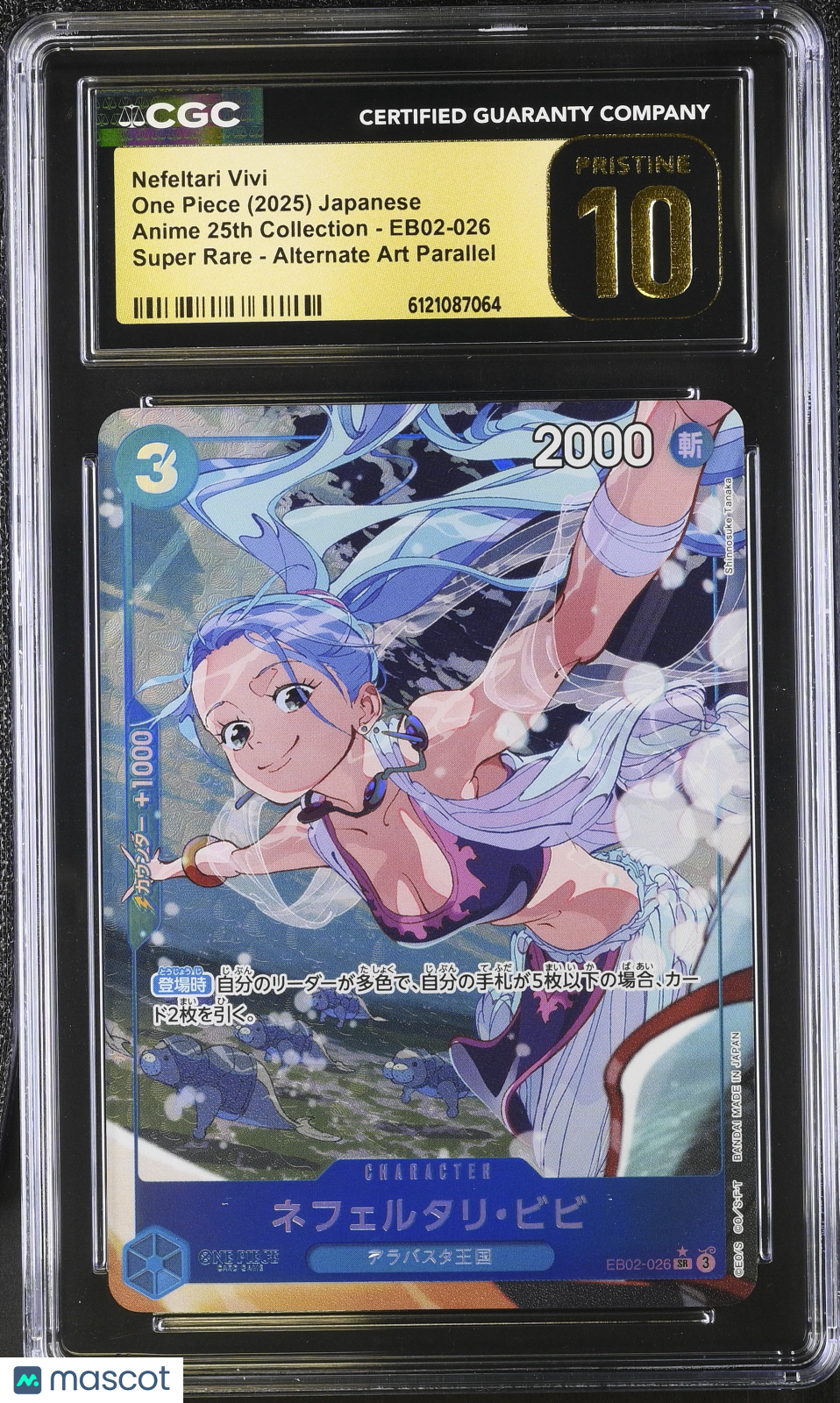 Nefeltari Vivi #EB02-026 Japanese 2025 One Piece Anime 25th Collection CGC 10 Don’t miss your chance to own this stunning Nefeltari Vivi Alternate Art Parallel card from the highly anticipated 2025 One Piece Anime 25th Collection! Professionally graded CGC 10, this Japanese collectible is a true gem for One Piece fans and serious card collectors alike. With only 10 in the population, this card is a rare find and a must-have for anyone looking to elevate their collection with a top-tier, investment-grade piece. This card features the beloved character Nefeltari Vivi, certified by CGC with a unique certification number for authenticity and peace of mind. Manufactured by One Piece and presented in pristine condition, the card’s exclusive Alternate Art Parallel finish makes it even more desirable. Secure this highly sought-after collectible today before it’s gone! Graded: Yes Game: One Piece Set: 2025 One Piece Anime 25th Collection Language: Japanese Character: Nefeltari Vivi Certification Number: 6121087064 Grader: Certified Guaranty Company (CGC) Manufacturer: One Piece Population: 10 Grade: 10 Year Manufactured: 2025 Card Number: EB02-026 Finish: Alternate Art Parallel Listed With Mascot.