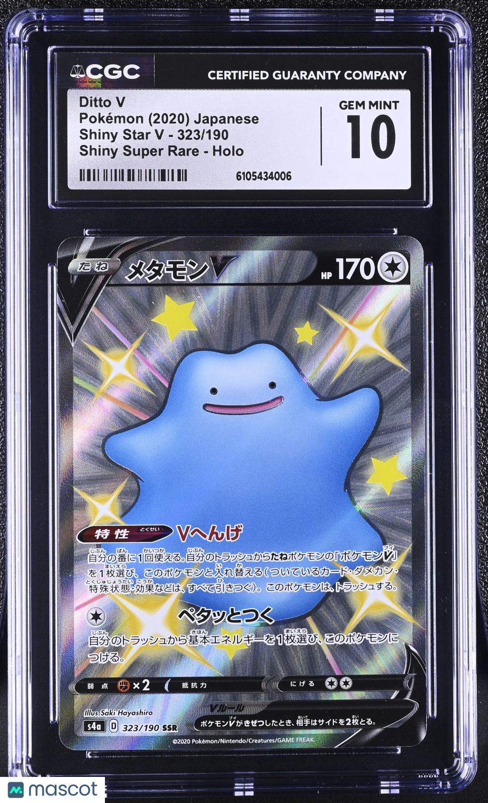 Pokemon Ditto V #323/190 Japanese Shiny Star V Super Rare CGC 10 Gem Mint 2d Don’t miss your chance to own this stunning 2020 Japanese Pokemon Ditto V from the highly sought-after Shiny Star V set! Professionally graded a perfect CGC 10 Gem Mint, this Shiny Super Rare card (#323/190) features a dazzling holo finish and is a must-have for serious collectors and Pokemon TCG fans. With only 505 in the population, this card is a rare find and comes certified with CGC’s trusted grading and verification—add this gem to your collection today before it’s gone! This authentic Japanese Ditto V card is loaded with collector appeal, featuring Shiny Super Rare status and original packaging from Pokemon. Whether you’re looking to complete your Shiny Star V set or searching for that perfect graded card, this Ditto V stands out for its pristine condition, rarity, and eye-catching finish. Secure this investment-grade collectible and elevate your Pokemon collection now! Set: 2020 Pokemon Shiny Star V Character: Ditto V Certification Number: 6105434006 Grader: Certified Guaranty Company (CGC) Grade: 10 Year Manufactured: 2020 Graded: Yes Rarity: Shiny Super Rare Game: Pokemon Language: Japanese Manufacturer: Pokemon Population: 505 Features: Shiny Super Rare Card Number: 323/190 Finish: Holo Listed With Mascot.