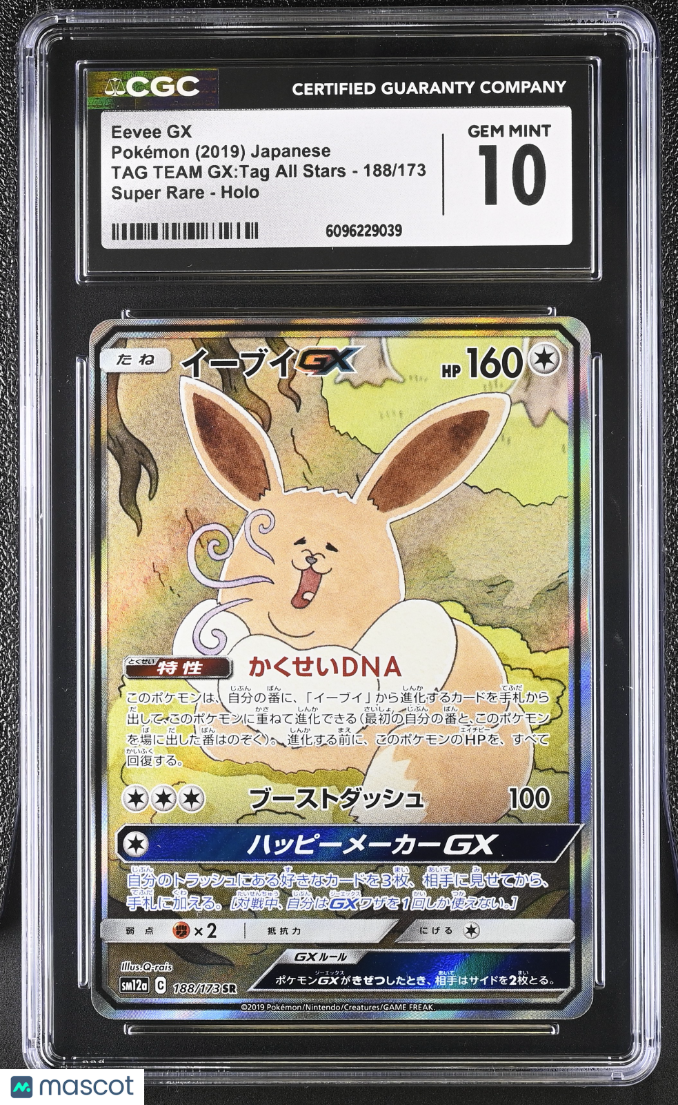 You are purchasing a Pokemon Eevee GX #188/173 Japanese Super Rare CGC 10. You will receive the exact item in the photographs. Be sure to check our store for hundreds of other graded cards just like this one. Follow our store to receive exclusive discounts on graded cards and other Pokemon products. Join us during our LIVE stream events where we showcase graded cards, raw singles, and booster packs. Thank you for looking. Listed With Mascot.