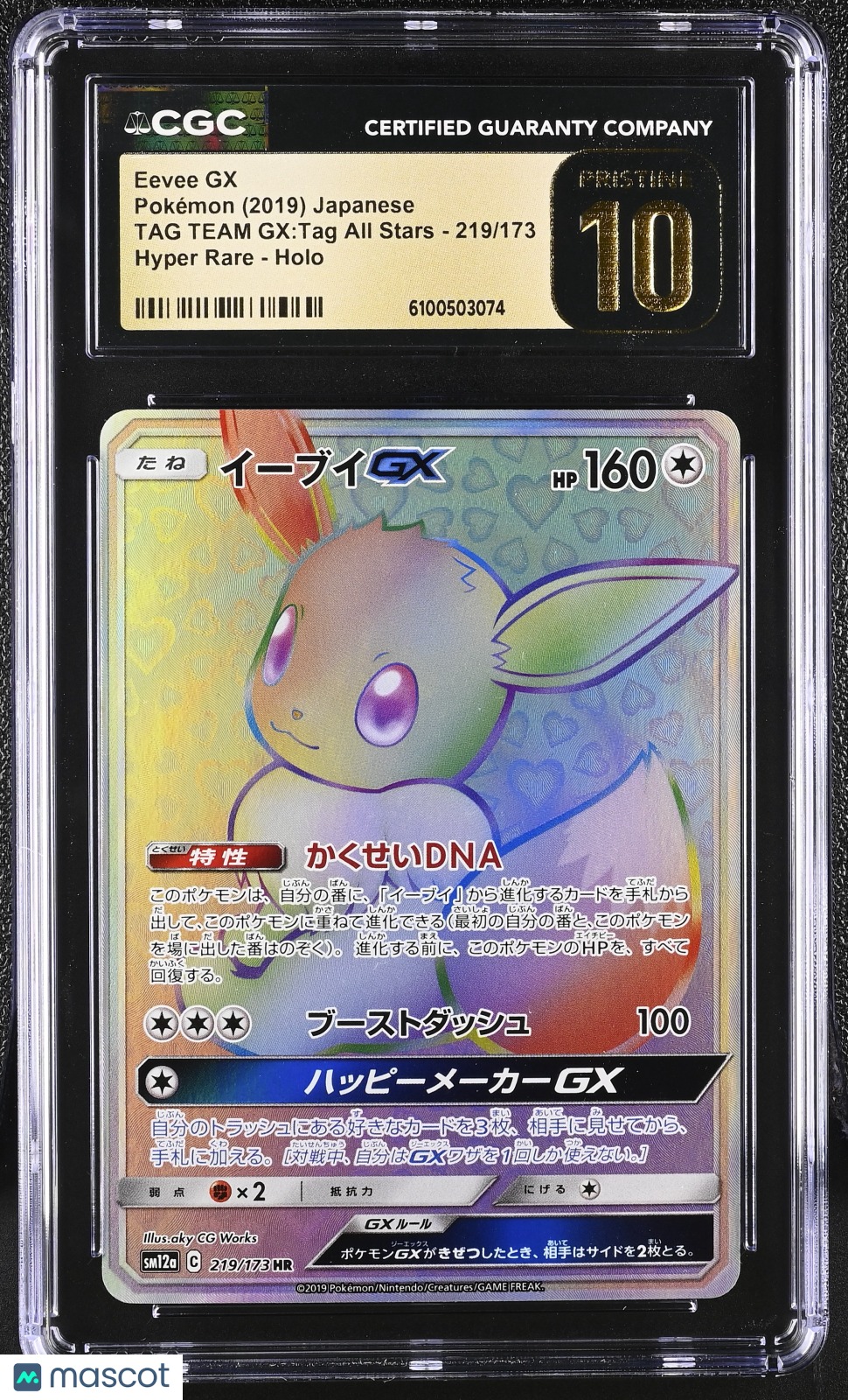 You are purchasing a Pokemon Eevee GX #219/173 Japanese Hyper Rare CGC 10 A3. You will receive the exact item in the photographs. Be sure to check our store for hundreds of other graded cards just like this one. Follow our store to receive exclusive discounts on graded cards and other Pokemon products. Join us during our LIVE stream events where we showcase graded cards, raw singles, and booster packs. Thank you for looking. Listed With Mascot.
