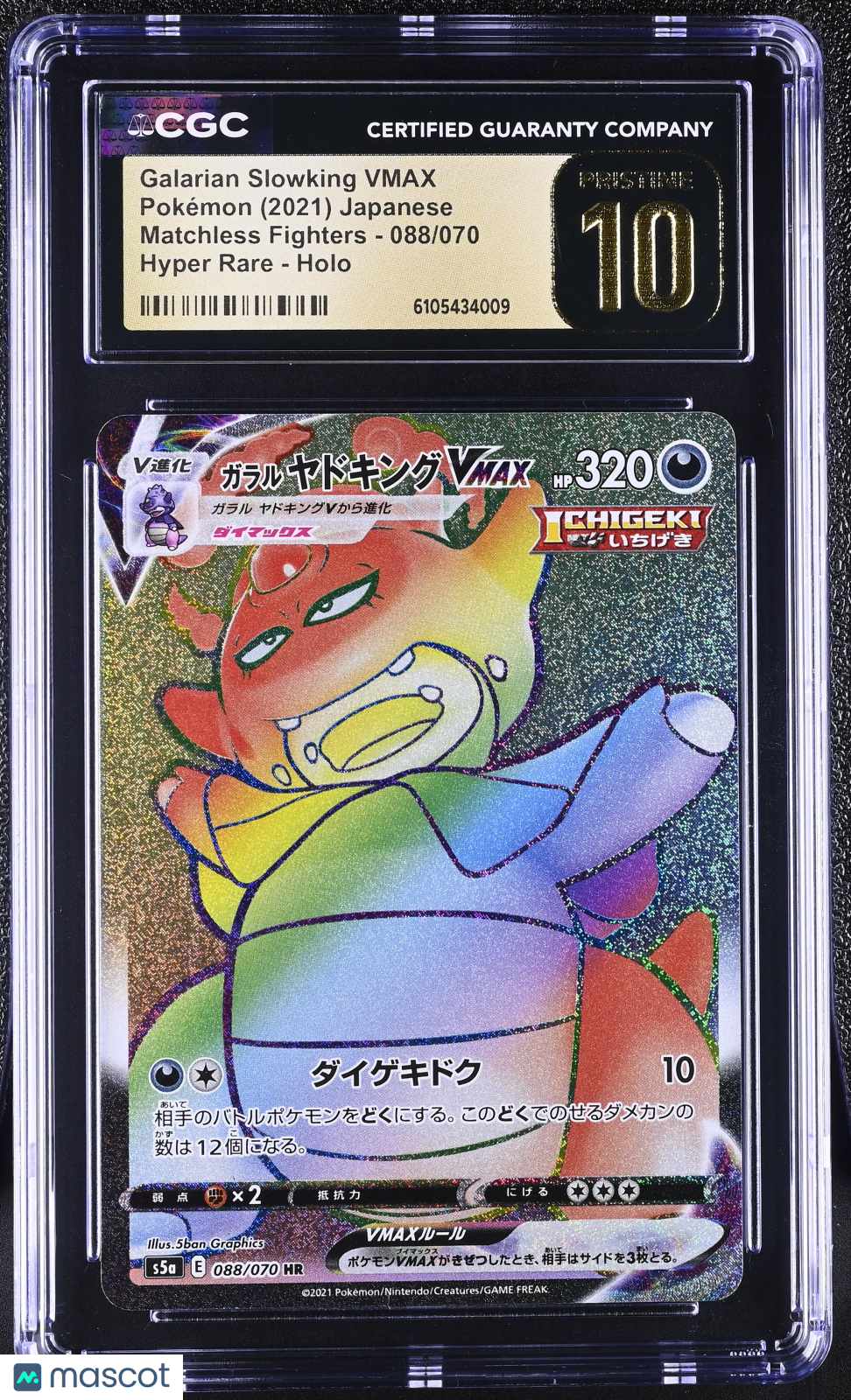 Pokemon Galarian Slowking VMAX #088/070 Japanese Hyper Rare CGC 10 Pristine 2d Don’t miss your chance to own this stunning 2021 Pokemon Matchless Fighters Galarian Slowking VMAX Hyper Rare, graded a perfect CGC 10 Pristine! With a population of only 55, this Japanese holo card is a true collector’s gem and a standout addition to any Pokemon TCG collection. The brilliant Hyper Rare finish, combined with the prestige of a top-tier CGC grade and certification number 6105434009, makes this card highly sought after and ready to impress in any showcase. Perfect for serious collectors and Pokemon fans alike, this rare card features the beloved Galarian Slowking VMAX in all its glory, straight from the Japanese release. Secure this exclusive piece today and elevate your collection with a card that’s as rare as it is beautiful! Set: 2021 Pokemon Matchless Fighters Character: Galarian Slowking VMAX Certification Number: 6105434009 Grader: Certified Guaranty Company (CGC) Grade: 10 Year Manufactured: 2021 Graded: Yes Rarity: Hyper Rare Game: Pokemon Language: Japanese Manufacturer: Pokemon Population: 55 Features: Hyper Rare Card Number: 088/070 Finish: Holo Listed With Mascot.