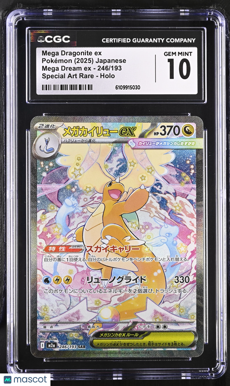 Pokemon Mega Dragonite ex #246/193 SAR Japanese Mega Dream CGC 10 Gem Mint L1 Don’t miss your chance to own this stunning Mega Dragonite ex from the highly anticipated 2025 Pokemon Mega Dream EX set! Professionally graded a perfect CGC 10 Gem Mint, this Japanese Special Art Rare card (#246/193) stands out with its dazzling holo finish and exclusive artwork, making it a must-have for serious collectors and Pokemon fans alike. With a population of only 38, this rare gem is a true centerpiece for any collection and a top investment opportunity. Certified by the trusted Certified Guaranty Company (CGC) and featuring a unique certification number (6109915030), this card guarantees authenticity and top-tier condition. Whether you’re looking to complete your set, upgrade your collection, or secure a valuable piece of Pokemon history, this Mega Dragonite ex SAR is ready to ship and sure to impress. Act fast—rare cards like this don’t last long! Set: 2025 Pokemon Mega Dream EX Character: Mega Dragonite ex Certification Number: 6109915030 Grader: Certified Guaranty Company (CGC) Grade: 10 Year Manufactured: 2025 Graded: Yes Rarity: Special Art Rare Game: Pokemon Language: Japanese Manufacturer: Pokemon Population: 38 Features: Special Art Rare Card Number: 246/193 Finish: Holo Listed With Mascot.