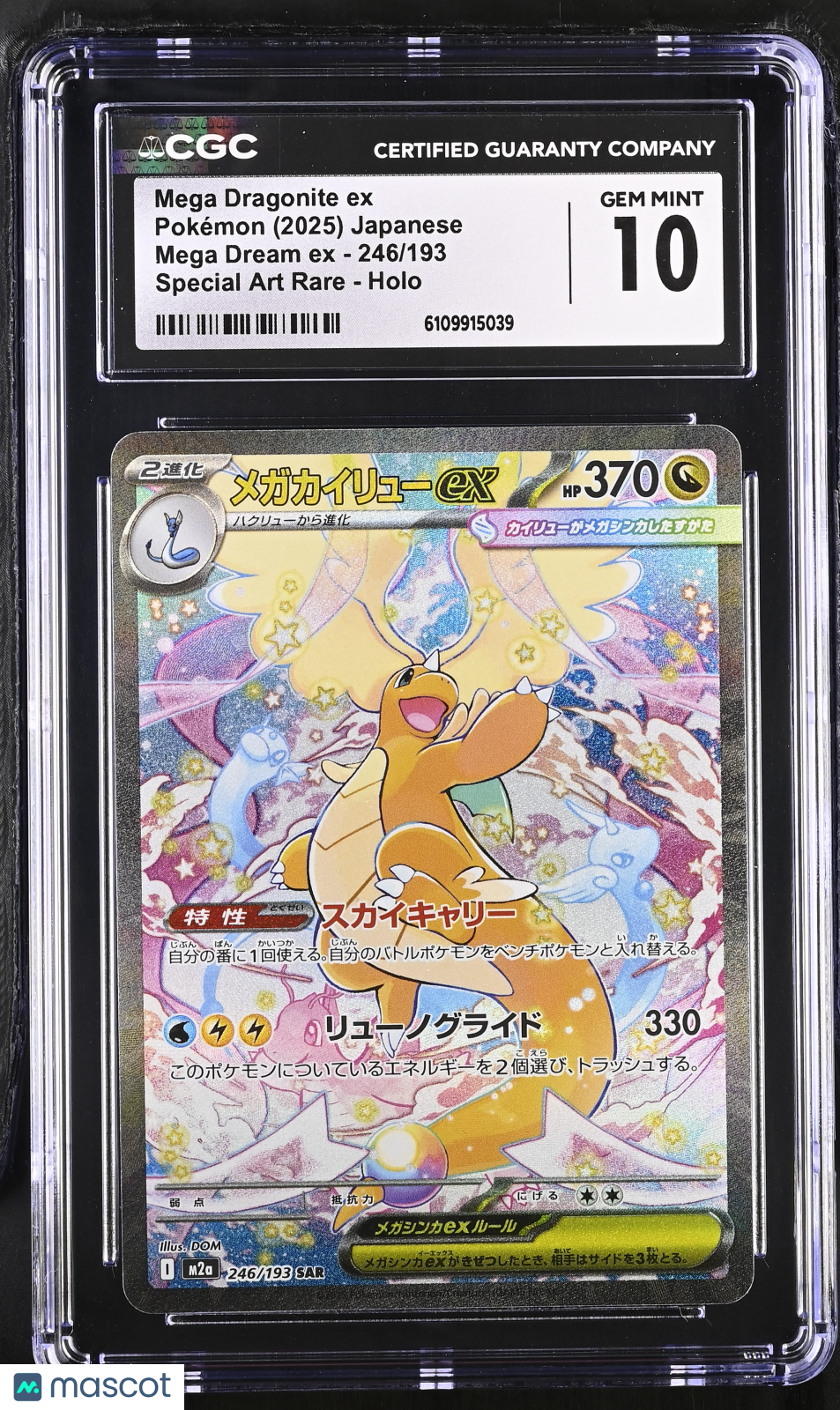 Pokemon Mega Dragonite ex #246/193 SAR Japanese Mega Dream CGC 10 Gem Mint L1 Don’t miss your chance to own this stunning Mega Dragonite ex from the 2025 Pokemon Mega Dream EX set! This Japanese Special Art Rare is professionally graded a perfect CGC 10 Gem Mint, making it a true gem for serious Pokemon card collectors. With a population of only 38, this card stands out for its rarity, dazzling holo finish, and unique artwork that’s sure to impress in any collection. Certified by the trusted Certified Guaranty Company (CGC) with certification number 6109915039, this card is a must-have for fans and investors alike. Secure this highly sought-after piece of Pokemon history today—opportunities like this don’t last long! Set: 2025 Pokemon Mega Dream EX Character: Mega Dragonite ex Certification Number: 6109915039 Grader: Certified Guaranty Company (CGC) Grade: 10 Year Manufactured: 2025 Graded: Yes Rarity: Special Art Rare Game: Pokemon Language: Japanese Manufacturer: Pokemon Population: 38 Features: Special Art Rare Card Number: 246/193 Finish: Holo Listed With Mascot.