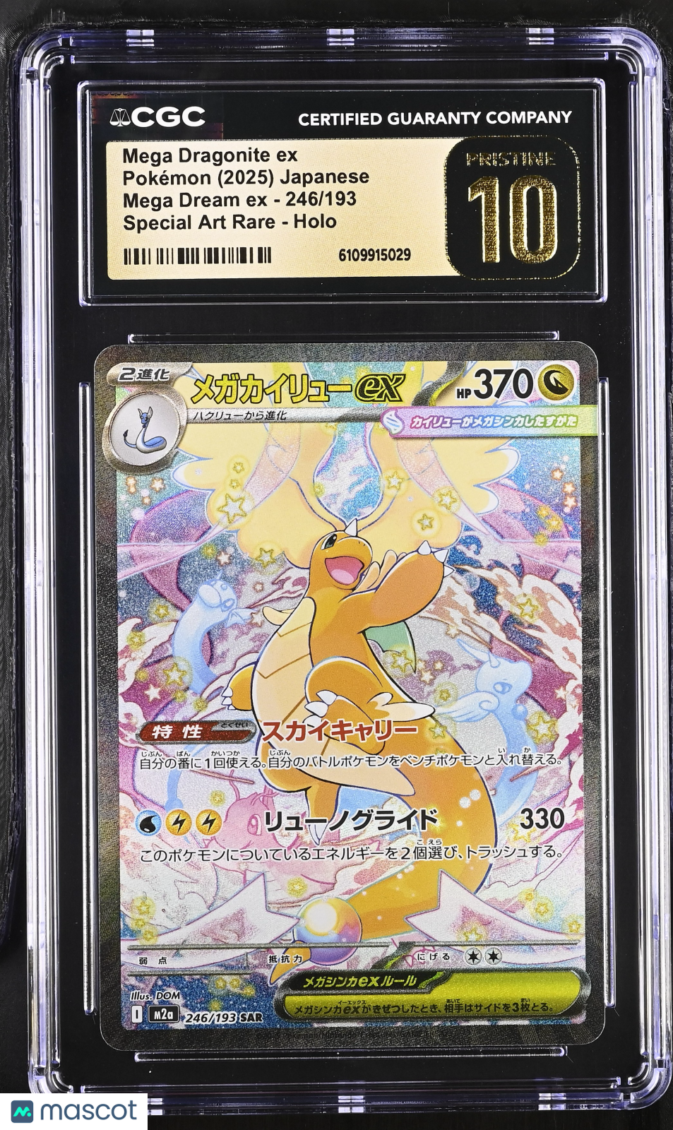 Pokemon Mega Dragonite ex #246 SAR Japanese Mega Dream CGC 10 Pristine L1 Don't miss your chance to own this stunning 2025 Pokemon Mega Dream EX Mega Dragonite ex, graded a flawless CGC 10 Pristine! This highly sought-after Special Art Rare (SAR) features a breathtaking holo finish and is certified by Certified Guaranty Company, making it a true centerpiece for any Pokemon collector. With only 72 in the population and a unique certification number (6109915029), this Japanese release stands out as a rare gem for serious enthusiasts and investors. Whether you're looking to complete your Mega Dream EX set or searching for a top-tier investment card, this Mega Dragonite ex #246/193 checks all the boxes. Secure this limited population, professionally graded treasure today and elevate your collection with one of the most desirable cards of the year! Set: 2025 Pokemon Mega Dream EX Character: Mega Dragonite ex Certification Number: 6109915029 Grader: Certified Guaranty Company (CGC) Grade: 10 Year Manufactured: 2025 Graded: Yes Rarity: Special Art Rare Game: Pokemon Language: Japanese Manufacturer: Pokemon Population: 72 Features: Special Art Rare Card Number: 246/193 Finish: Holo Listed With Mascot.