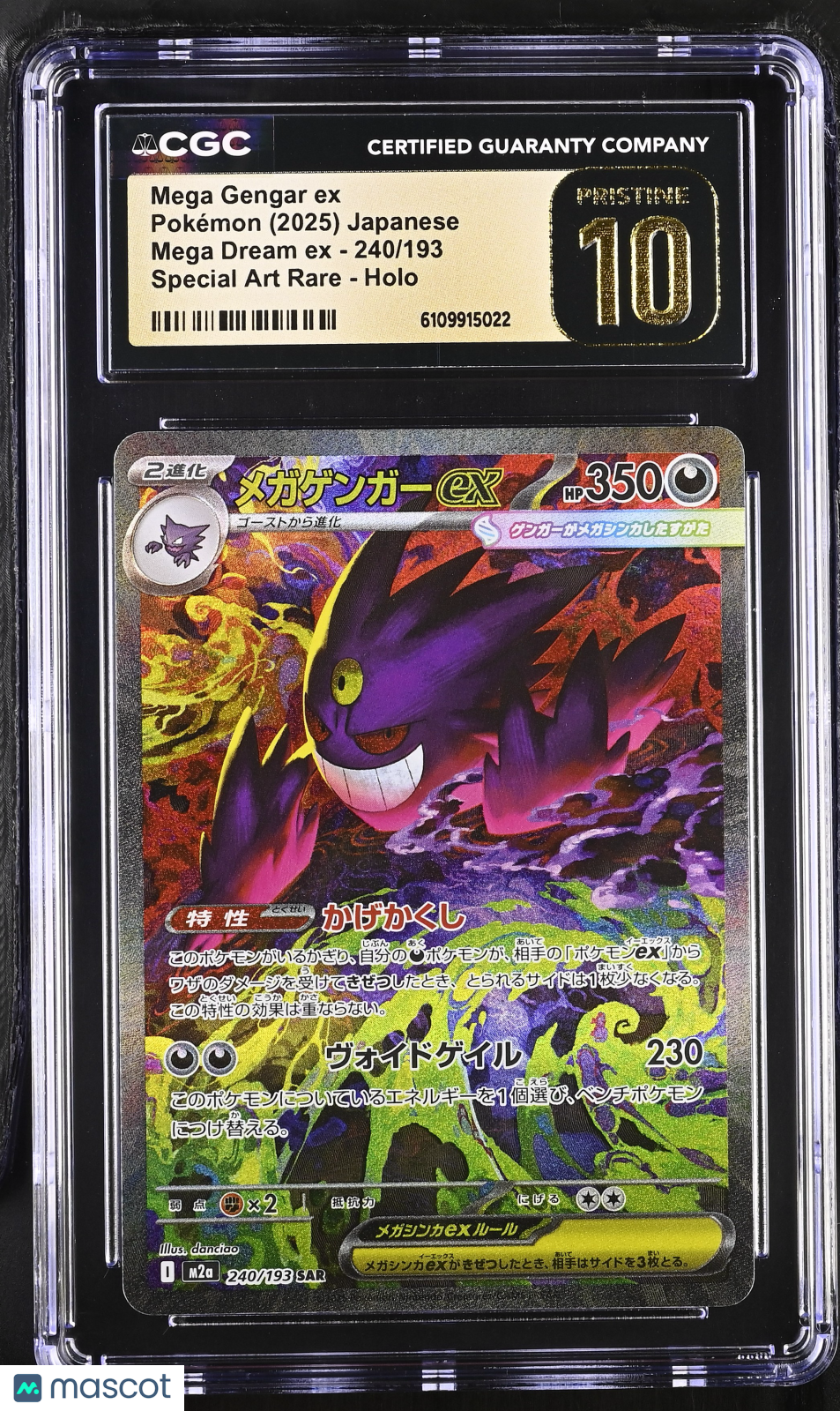 Pokemon Mega Gengar ex #240/193 SAR Japanese Mega Dream CGC 10 Pristine L1 Don’t miss your chance to own this ultra-rare 2025 Pokemon Mega Gengar ex Special Art Rare from the highly anticipated Mega Dream EX set! Professionally graded a perfect CGC 10 Pristine, this Japanese holo card (#240/193) is a true gem for serious collectors and Pokemon fans alike. With only 72 in the population, this card stands out as a must-have centerpiece for any high-end collection. This Mega Gengar ex features stunning special art and a brilliant holo finish, making it a showstopper in any display. Secure this investment-grade card today—opportunities like this don’t last long, especially with such a low population and top-tier grading. Add this certified Pokemon treasure to your collection before it’s gone! Set: 2025 Pokemon Mega Dream EX Character: Mega Gengar ex Certification Number: 6109915022 Grader: Certified Guaranty Company (CGC) Grade: 10 Year Manufactured: 2025 Graded: Yes Rarity: Special Art Rare Game: Pokemon Language: Japanese Manufacturer: Pokemon Population: 72 Features: Special Art Rare Card Number: 240/193 Finish: Holo Listed With Mascot.
