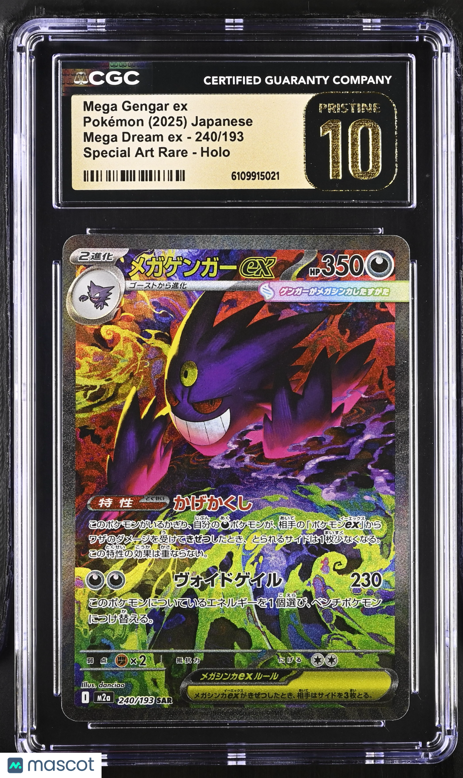 Pokemon Mega Gengar ex #240/193 SAR Japanese Mega Dream CGC 10 Pristine L1 Don't miss your chance to own this stunning 2025 Pokemon Mega Gengar ex Special Art Rare from the highly anticipated Mega Dream EX set! Professionally graded a perfect CGC 10 Pristine, this Japanese holo card (card #240/193) is a true collector's gem with only 72 in the population, making it a rare find for serious Pokemon fans and investors alike. This card features vibrant holo finish and exclusive Special Art Rare artwork, certified by CGC with certification number 6109915021. Secure this high-demand Mega Gengar ex for your collection today—pristine cards like this don't last long on the market! Set: 2025 Pokemon Mega Dream EX Character: Mega Gengar ex Certification Number: 6109915021 Grader: Certified Guaranty Company (CGC) Grade: 10 Year Manufactured: 2025 Graded: Yes Rarity: Special Art Rare Game: Pokemon Language: Japanese Manufacturer: Pokemon Population: 72 Features: Special Art Rare Card Number: 240/193 Finish: Holo Listed With Mascot.