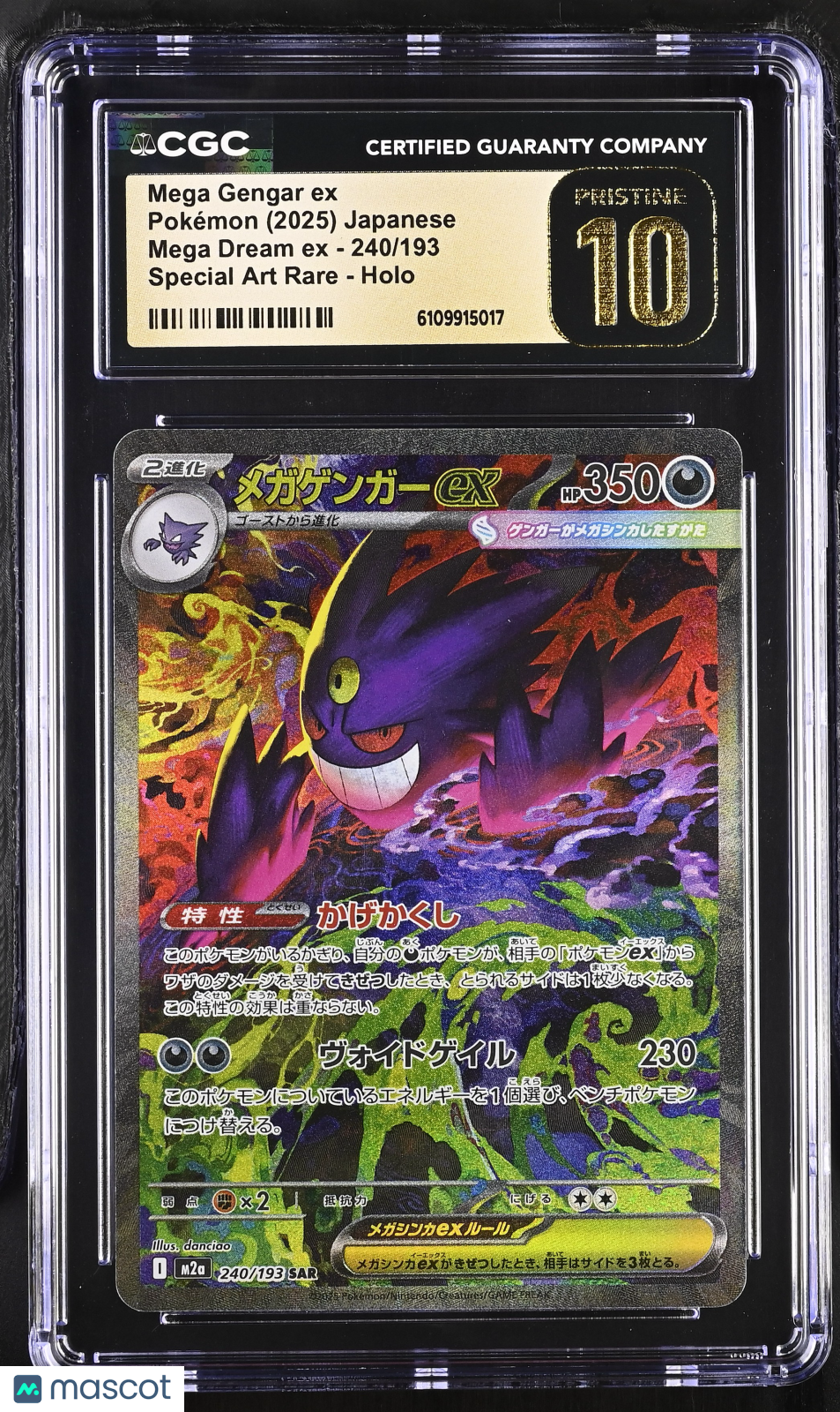 Pokemon Mega Gengar ex #240/193 SAR Japanese Mega Dream CGC 10 Pristine L1 Don't miss your chance to own this stunning Mega Gengar ex Special Art Rare from the 2025 Pokemon Mega Dream EX set! Professionally graded a perfect CGC 10 Pristine, this Japanese holo card (#240/193) is a true collector's gem, with only 72 in the population. The vibrant artwork and flawless finish make it a must-have centerpiece for any serious Pokemon TCG collection. This card comes authenticated by Certified Guaranty Company (CGC) with certification number 6109915017, guaranteeing its authenticity and pristine condition. As a rare Special Art Rare, it’s highly sought after and sure to appreciate in value—secure this exclusive piece of Pokemon history today before it’s gone! Set: 2025 Pokemon Mega Dream EX Character: Mega Gengar ex Certification Number: 6109915017 Grader: Certified Guaranty Company (CGC) Grade: 10 Year Manufactured: 2025 Graded: Yes Rarity: Special Art Rare Game: Pokemon Language: Japanese Manufacturer: Pokemon Population: 72 Features: Special Art Rare Card Number: 240/193 Finish: Holo Listed With Mascot.