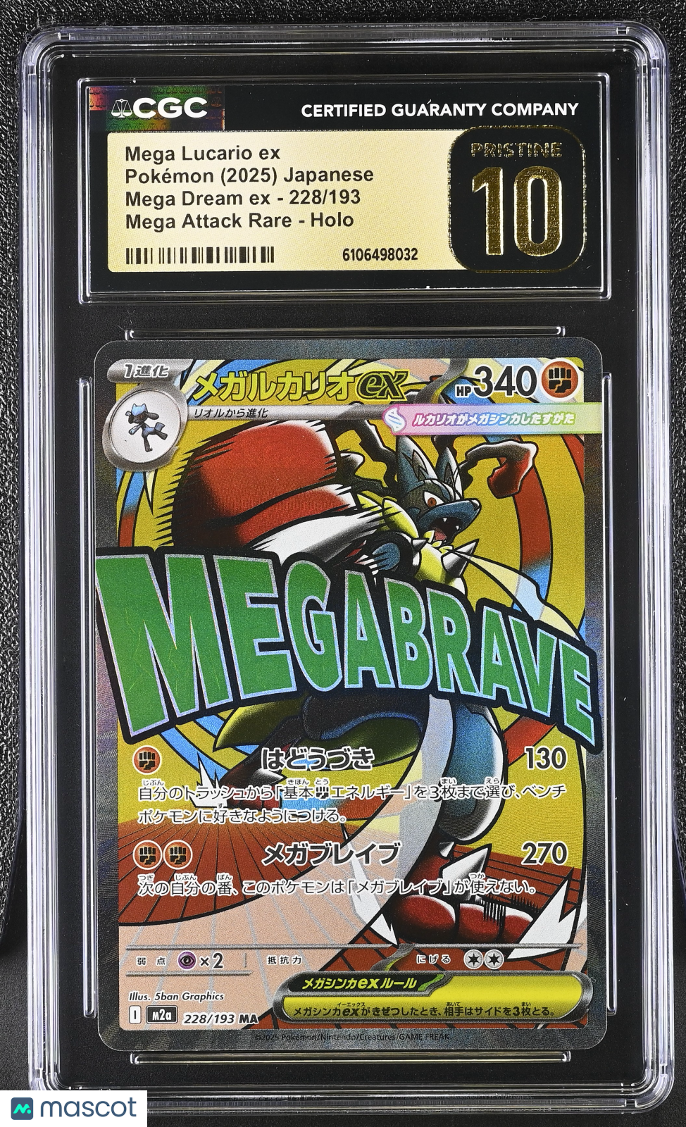 You are purchasing a Pokemon Mega Lucario ex #228/193 Japanese Mega Attack Rare CGC 10. You will receive the exact item in the photographs. Be sure to check our store for hundreds of other graded cards just like this one. Follow our store to receive exclusive discounts on graded cards and other Pokemon products. Join us during our LIVE stream events where we showcase graded cards, raw singles, and booster packs. Thank you for looking. Listed With Mascot.