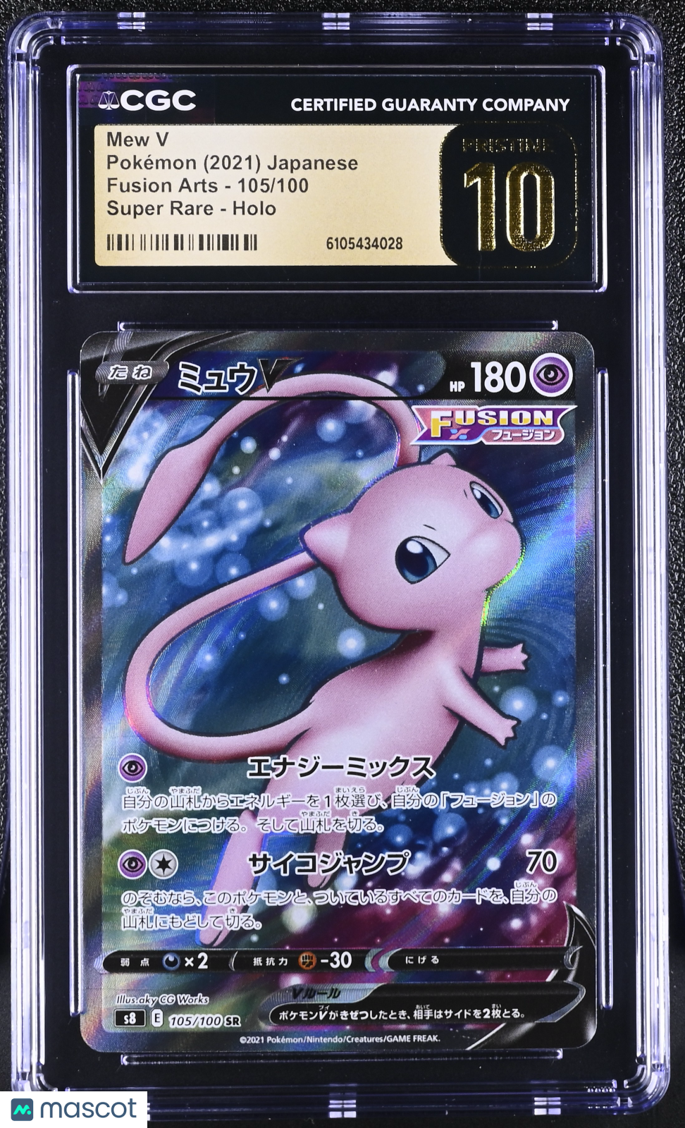 Pokemon Mew V #105/100 Japanese Fusion Strike Super Rare CGC 10 Pristine Don't miss your chance to own this stunning 2021 Japanese Pokemon Fusion Arts Mew V, card number 105/100, graded a perfect CGC 10 Pristine! This super rare holo card is a must-have for serious collectors and Mew fans, boasting a low population of just 82 in this grade. With its vibrant artwork and pristine condition, this card stands out as a true gem in any Pokemon TCG collection. Certified by the respected Certified Guaranty Company (CGC) with certification number 6105434028, this Japanese-language card features the highly sought-after super rare finish. Secure this incredible investment piece today and elevate your collection with one of the best Mew V cards available on the market! Set: 2021 Pokemon Fusion Arts Character: Mew V Certification Number: 6105434028 Grader: Certified Guaranty Company (CGC) Grade: 10 Year Manufactured: 2021 Graded: Yes Rarity: Super Rare Game: Pokemon Language: Japanese Manufacturer: Pokemon Population: 82 Features: Super Rare Card Number: 105/100 Finish: Holo Listed With Mascot.