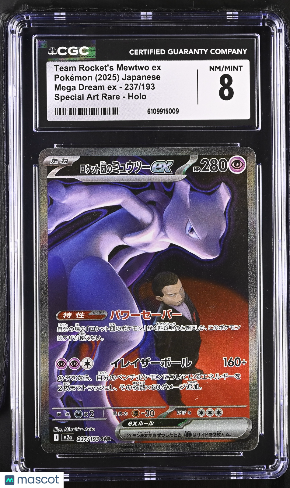 Pokemon Team Rocket's Mewtwo ex #237/193 Japanese Mega Dream CGC 8 L1 Don't miss your chance to own this stunning Team Rocket's Mewtwo ex from the 2025 Pokemon Mega Dream EX set! Professionally graded CGC 8 and showcasing the highly sought-after Special Art Rare holo finish, this Japanese card is a must-have for serious Pokemon collectors and Mewtwo fans alike. With its unique artwork and exceptional rarity, this card stands out as a true centerpiece for any collection. Certified by CGC with certification number 6109915009, this card is guaranteed authentic and graded for quality. As a Special Art Rare with a population of 0, this Mewtwo ex is an ultra-rare find—perfect for display, investment, or as a highlight in your Pokemon TCG collection. Secure this gem today before it's gone! Set: 2025 Pokemon Mega Dream EX Character: Team Rocket's Mewtwo ex Certification Number: 6109915009 Grader: Certified Guaranty Company (CGC) Year Manufactured: 2025 Grade: 8 Graded: Yes Rarity: Special Art Rare Game: Pokemon Language: Japanese Manufacturer: Pokemon Population: 0 Features: Special Art Rare Card Number: 237/193 Finish: Holo Listed With Mascot.