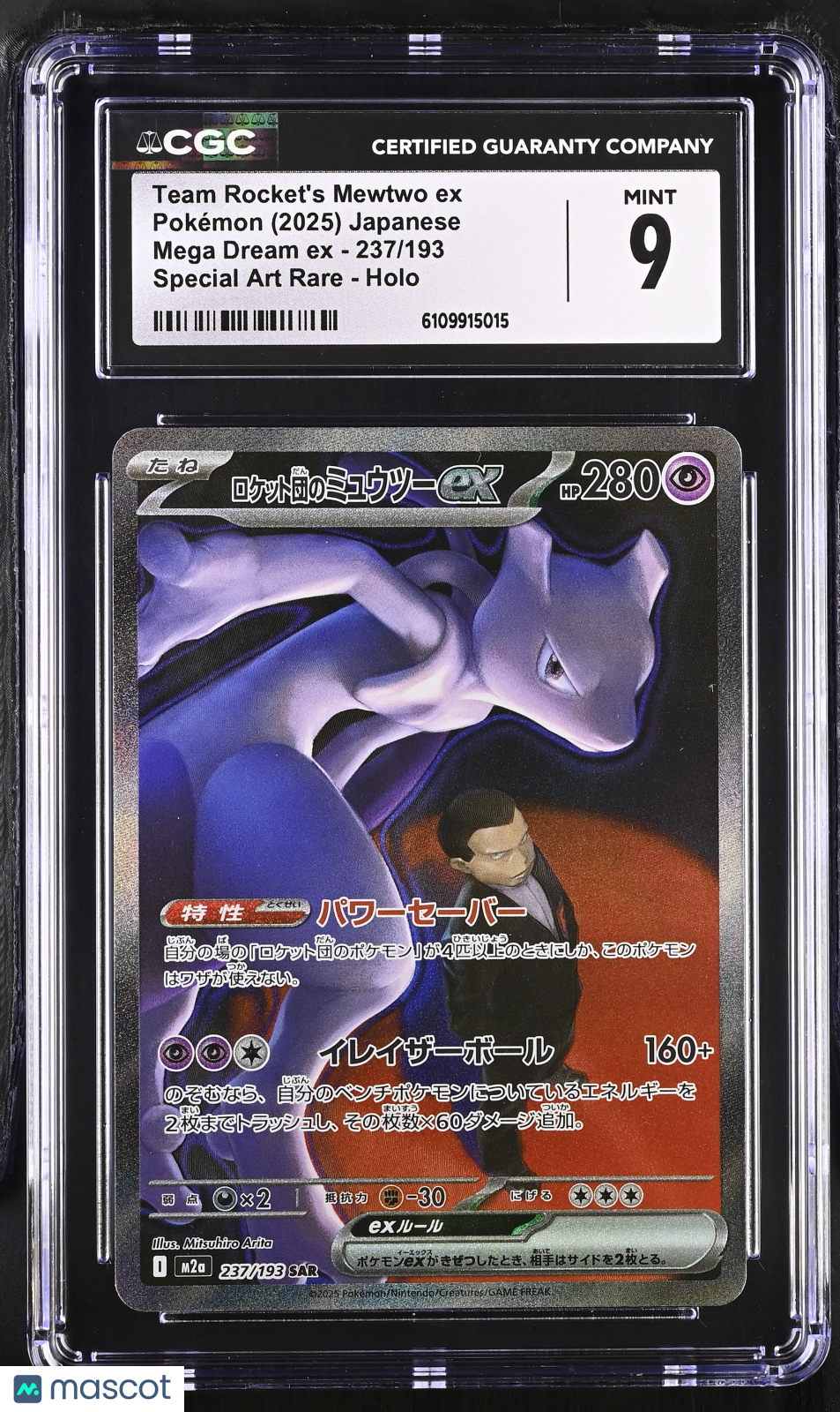 Pokemon Team Rocket's Mewtwo ex #237/193 Japanese Mega Dream CGC 9 Mint L1 Don't miss your chance to own this ultra-rare Team Rocket's Mewtwo ex from the highly anticipated 2025 Pokemon Mega Dream EX set! Professionally graded a strong Mint 9 by Certified Guaranty Company (CGC), this Japanese Special Art Rare card (#237/193) is a standout collectible, boasting a stunning holo finish and exclusive artwork that will elevate any collection. With only 9 graded in the population, this card is a true gem for serious collectors and Pokemon fans alike. This card comes fully authenticated with certification number 6109915015, ensuring authenticity and peace of mind. As a Special Art Rare, its unique design and limited availability make it a must-have for anyone looking to secure a centerpiece for their Pokemon TCG collection. Act fast—rare opportunities like this don’t last long! Set: 2025 Pokemon Mega Dream EX Character: Team Rocket's Mewtwo ex Certification Number: 6109915015 Grader: Certified Guaranty Company (CGC) Year Manufactured: 2025 Grade: 9 Graded: Yes Rarity: Special Art Rare Game: Pokemon Language: Japanese Manufacturer: Pokemon Population: 9 Features: Special Art Rare Card Number: 237/193 Finish: Holo Listed With Mascot.