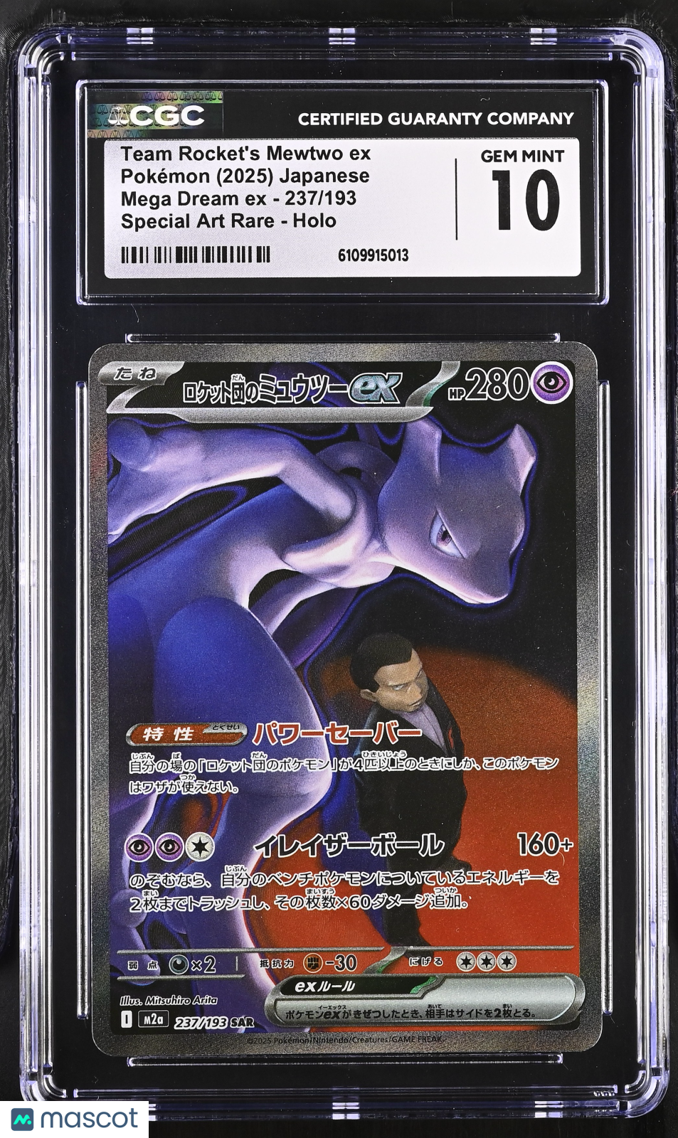 Pokemon Team Rocket's Mewtwo ex #237 SAR Japanese Mega Dream CGC 10 Gem Mint L1 Up for grabs is an ultra-rare 2025 Pokemon Mega Dream EX Team Rocket's Mewtwo ex, graded a flawless CGC 10 Gem Mint! This Japanese Special Art Rare (SAR) card, featuring a stunning holo finish, is a true collector’s gem with only 18 in the CGC population. Don’t miss your chance to own this highly sought-after card, perfect for serious Pokemon enthusiasts and investors alike. This card is authenticated by Certified Guaranty Company (CGC) with certification number 6109915013, ensuring its authenticity and pristine condition. With its unique artwork and limited availability, Team Rocket’s Mewtwo ex SAR is a standout addition to any high-end Pokemon collection. Act fast—rare opportunities like this don’t last long! Set: 2025 Pokemon Mega Dream EX Character: Team Rocket's Mewtwo ex Certification Number: 6109915013 Grader: Certified Guaranty Company (CGC) Grade: 10 Year Manufactured: 2025 Graded: Yes Rarity: Special Art Rare Game: Pokemon Language: Japanese Manufacturer: Pokemon Population: 18 Features: Special Art Rare Card Number: 237/193 Finish: Holo Listed With Mascot.