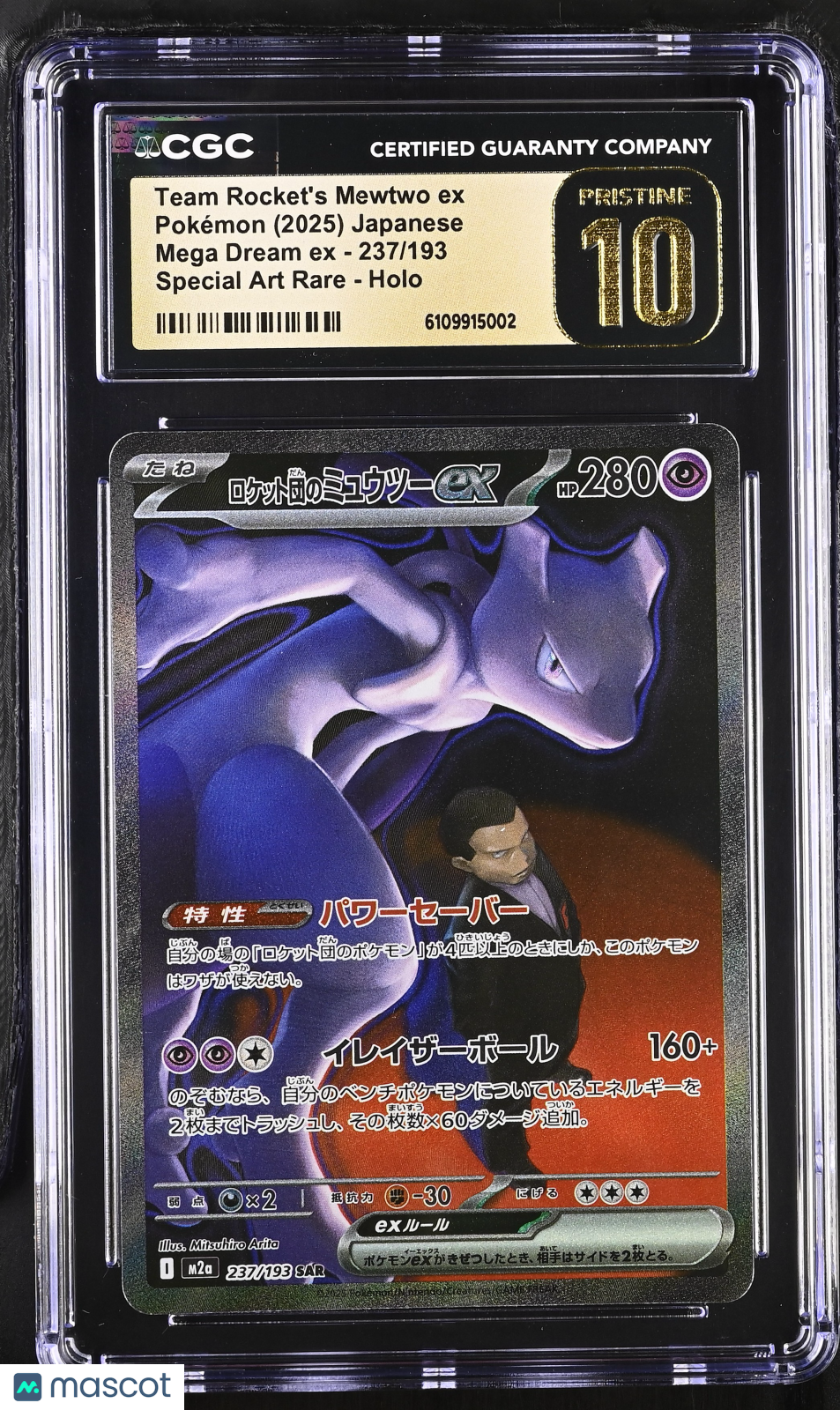 Pokemon Team Rocket's Mewtwo ex #237/193 SAR Japanese CGC 10 Pristine L1 Don't miss your chance to own this ultra-rare 2025 Pokemon Mega Dream EX Team Rocket's Mewtwo ex, graded a perfect CGC 10 Pristine! This Japanese Special Art Rare (SAR) card features stunning holo finish and is one of only 23 in the population, making it a true gem for serious collectors and Pokemon fans alike. The card is professionally graded and certified by Certified Guaranty Company (CGC), ensuring authenticity and top-tier condition. This highly sought-after card, with its unique Team Rocket artwork and special features, is a standout addition to any Pokemon TCG collection. Secure this rare find today—cards of this caliber and grade are rarely available, and demand is only growing among collectors worldwide! Set: 2025 Pokemon Mega Dream EX Character: Team Rocket's Mewtwo ex Certification Number: 6109915002 Grader: Certified Guaranty Company (CGC) Grade: 10 Year Manufactured: 2025 Graded: Yes Rarity: Special Art Rare Game: Pokemon Language: Japanese Manufacturer: Pokemon Population: 23 Features: Special Art Rare Card Number: 237/193 Finish: Holo Listed With Mascot.