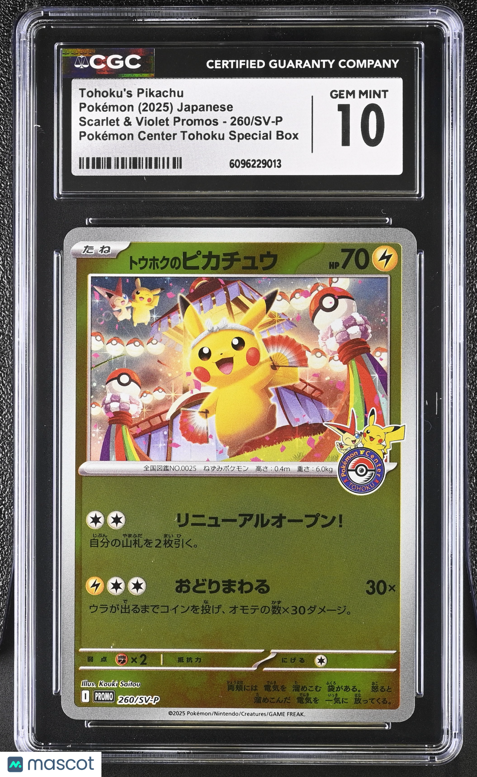 You are purchasing a Pokemon Tohoku's Pikachu #260/SV-P Japanese CGC 10. You will receive the exact item in the photographs. Be sure to check our store for hundreds of other graded cards just like this one. Follow our store to receive exclusive discounts on graded cards and other Pokemon products. Join us during our LIVE stream events where we showcase graded cards, raw singles, and booster packs. Thank you for looking. Listed With Mascot.