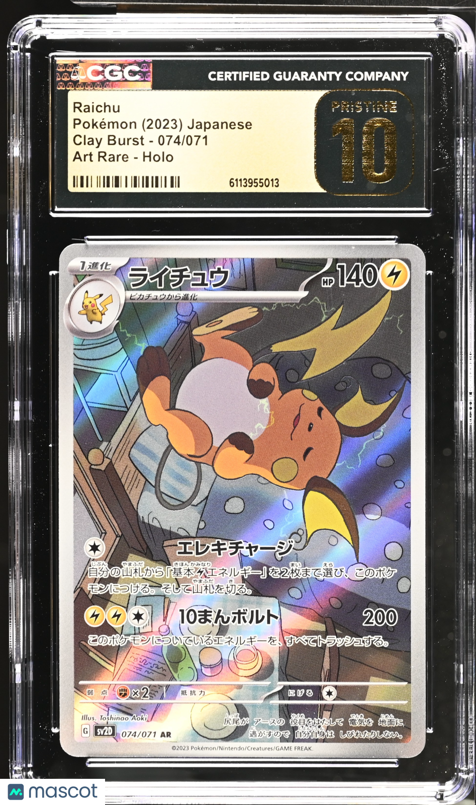 Raichu #074/071 Japanese 2023 Pokemon Clay Burst CGC 10 Don’t miss your chance to own this stunning Raichu Art Rare from the 2023 Pokemon Clay Burst set, graded a perfect CGC 10! This Japanese holo card boasts vibrant artwork and top-tier condition, making it a must-have for collectors and fans alike. With only 2,307 in the population, this card is a standout piece that’s sure to elevate any Pokemon collection. Certified by the Certified Guaranty Company and featuring a unique certification number (6113955013), this Raichu card is securely graded and ready for display. Secure this rare gem today and add a touch of brilliance to your Pokemon TCG lineup! Set: 2023 Pokemon Clay Burst Character: Raichu Certification Number: 6113955013 Grader: Certified Guaranty Company (CGC) Grade: 10 Year Manufactured: 2023 Graded: Yes Rarity: Art Rare Game: Pokemon Language: Japanese Manufacturer: Pokemon Population: 2307 Features: Art Rare Card Number: 074/071 Finish: Holo Listed With Mascot.